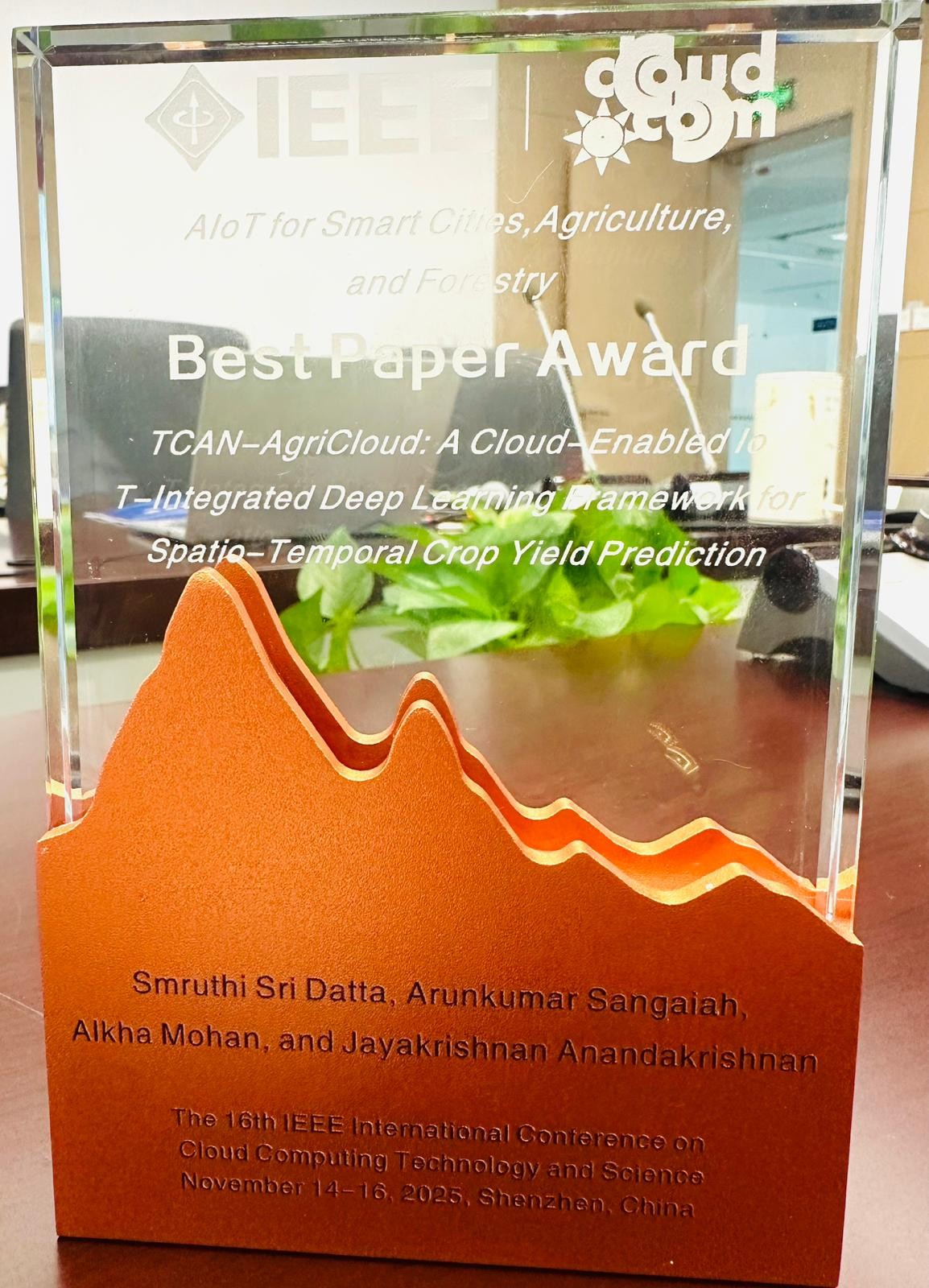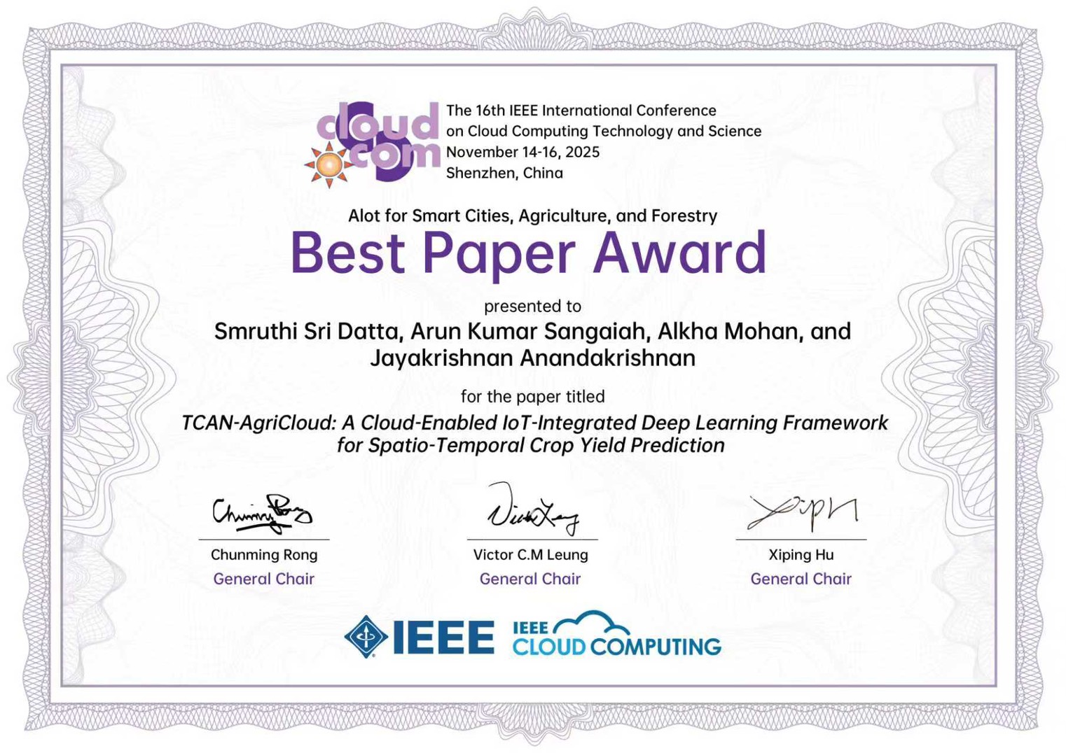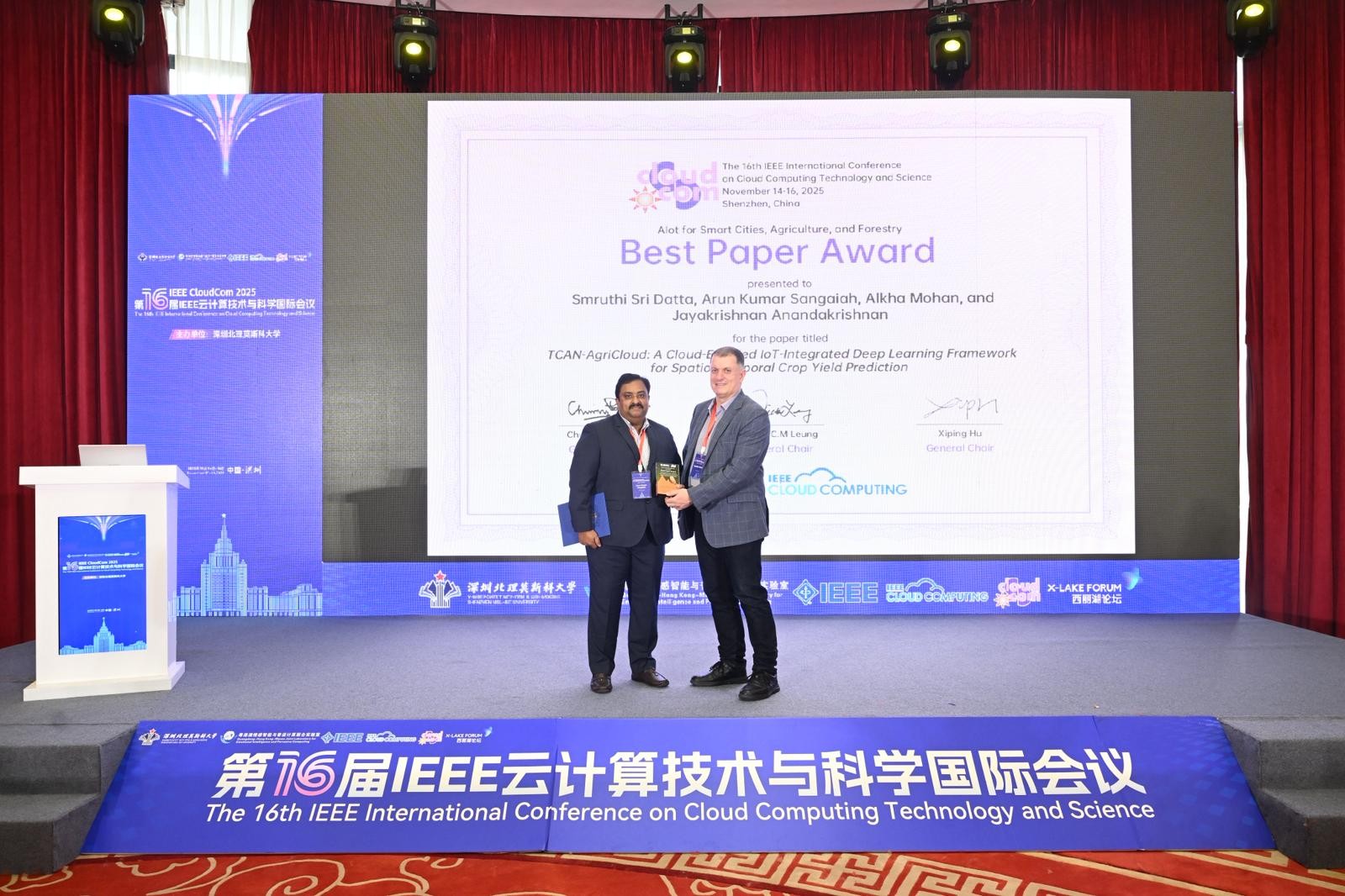 We are delighted to announce that Prof. Arun and our student Smruthi Sri Datta have received the Best Paper Award at The 16th IEEE International Conference on Cloud Computing Technology and Science (CloudCom 2025), held in Shenzhen, China.